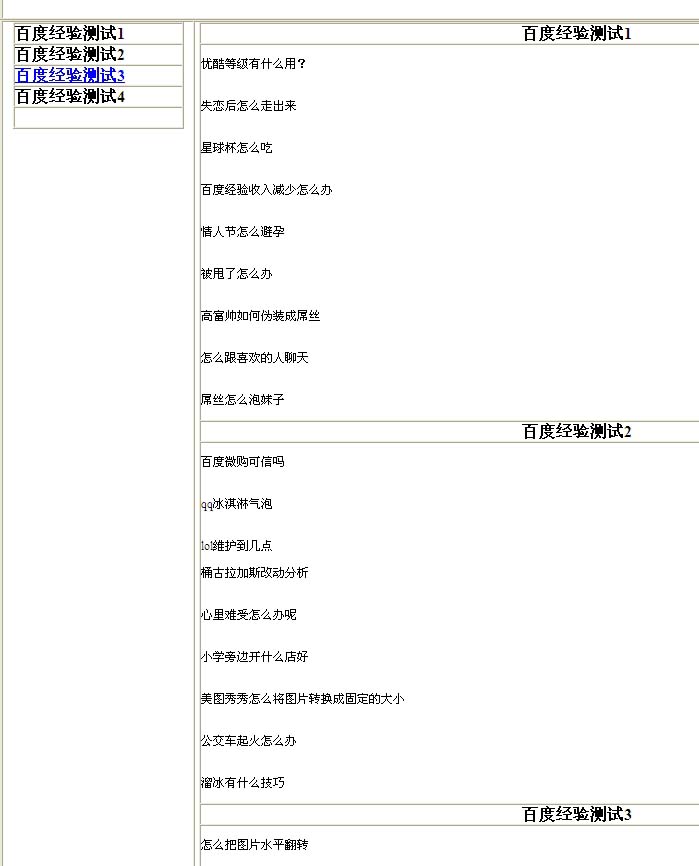 2、OK,這是我剛剛創建的一個頁面,左側為目錄,右邊為頁面。我們發現右面的頁面相對較長,不能完全顯示。這個時候,我們就需要錨點鏈接。當我們想點擊“目錄”百度經驗測試3,就跳轉到相對應的右側測試3頁面,就需要有錨點鏈接。