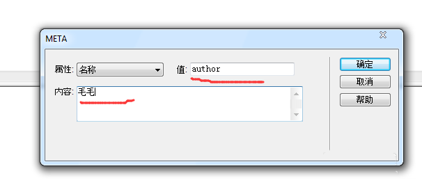 4、選擇第一個選項meta,這個功能一般用來注明作者,選擇值,注明是何值和需要表達的意思。我這裡選擇的是作者