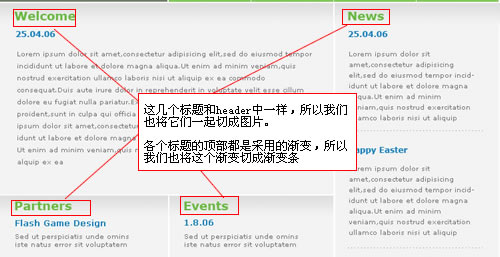 上圖所說的漸變條這我在補充一下,如果每個欄目中的漸變條是一樣的,我們切出一個漸變條即可,如果漸變的高度不同,那麼我們要切出多個漸變條。這個例子我們采用一個漸變就可以。