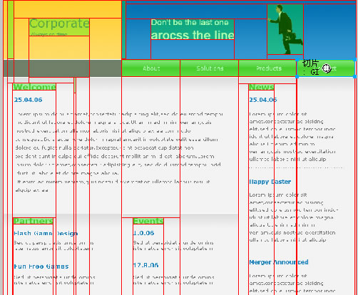 今天給大家講解一下,如何把一個設計好的頁面切割成一個可以在IE中浏覽的頁面。我為為大家介紹如何用Fireworks(以後簡稱FW)去切圖,因為我習慣用FW切圖。我們就用上次那個譯文中的設計稿做例子講解吧。