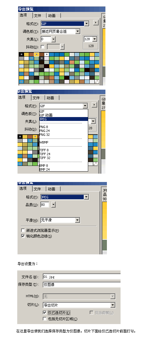 2.按Ctrl+Shift+X,打開導出預覽對話框。如果默認的格式為GIF,我們就要和下面操作一樣轉換成jpeg的。有多色彩和多漸變的圖像都要導出為jpeg的格式。只有單色的可以導出為gif格式的。