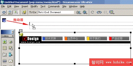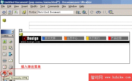3、將光標定位在這個層中,點擊Object面板中的插入Fireworks文件,將我們的彈出菜單插入此層中,如下圖所示:
