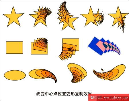 3、 旋轉變形符號功能:在執行旋轉變形前,現將對象轉變為符號,然後執行旋轉變形命令,執行完後通過改變符號中對象的中心點位置可以創造如下效果。