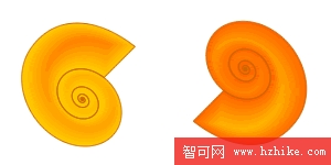 再來個粗細不均的圖形,我們以螺旋為范例,可以看出等高漸變填充的漸變相當平滑,它可以根據周邊的距離來進行漸變色計算,首先滿足的是最外層色彩,當漸變距離超過矢量物件本身的輪廓間距時,越靠近中心的顏色就越早被犧牲掉。