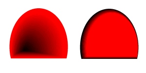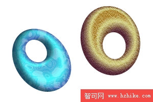 先來畫個簡單圖形來嘗試下這個新功能吧,這裡我們只用了兩種顏色,通過起始點角度變化來看效果。左圖已經出現深邃感,右圖能感覺到光照的方向。等高漸變填充的最大優勢,就是現在可以用漸變色來體現立體感。