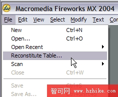 7.表格重建 如果你有裝滿切片的整個HTML表格,但是你沒有PNG源文件,表格重建命令將協助你解決問題。選擇File-->Reconstitute Tables,指定任一包含圖片切片表格的Html文件,Fireworks會把它導入並整合成PNG文件。Macromedia定義的JavaScript行為命令,例如翻轉圖像和彈出菜單等,會一並導入並掛靠在相應的切片中。