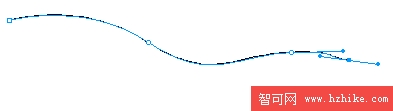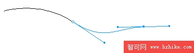 設定筆觸為黑色。使用鋼筆工具,在畫布的左部點出一個點,在畫布的中間再次點擊並拖動鼠標完成向上凸的一段曲線,松開鼠標。然後在畫布的右部點擊並拖動鼠標,完成向下凹的一段曲線。最後在右側再點一下。整條曲線的繪制過程以及最終效果如下所示:
