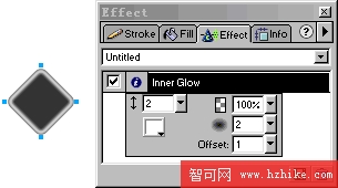 2、選中圖形,打開Effect(效果)面板,在效果列表中選擇Shadow and Glow(陰影與發光)項目中的Inner Glow(內發光)命令,為圓角矩形添加效果。