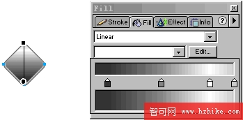 3、拷貝一份添加了效果後的圖形,刪除效果,在Info(信息)面板中將它的寬高各減少4像素。然後打開Fill(填充)面板,選擇Linear(直線)類型為圖形副本填充漸變。