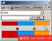 此時,由於路徑擴展成了填充對象,因為我們在Stroke面板中設置描邊值為None,切換至Fill面板,從Fill Category填充類型下拉列表中選擇Linear(線性漸變),然後點擊Edit按鈕,在漸變顏色編輯器中做如下圖所示的顏色設置,總共有四個顏色標記,分別是紅、藍、藍、黃,其中紅和藍顏色標記疊放在一起,藍和黃顏色標記疊放在一起。