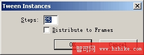 使用快捷方式Ctrl+A全選這二個對象,使用菜單命令Modify>Symbol>Tween Instances進行插幀操作,當Tween Instances對話窗口被打開時,設置Steps值為15~40中的一個值,本例中設置Steps為25。不要選擇Distribute to Frames選項,點擊OK按鈕。