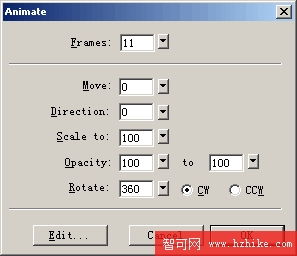 按F8鍵,當Symbol PropertIEs對話窗口被打開,此時我們選擇Animation類型,點擊OK按鈕。緊接著會跳出Animate對話窗口,在這兒我們設置Frames值為11,最下面的Rotate值為360,其他的就按照默認的設置可以了,點擊OK按鈕。這個創建動畫過程可能需要一點等待的時間,請耐心一些,因為程序正在相應地自動生成各個幀中的動畫。