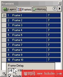 如果您覺得當前動畫的播放速度有點快,點擊Frame1幀,然後按住Shift鍵,點擊Frame10幀,此時這些幀對象都被選中了,雙擊任何一幀右邊的“7”的位置,此時會彈出Frame Delay對話窗口中,我們可以加大這個數值,這樣就可以加長幀的延遲時間,本例中我設置為20。