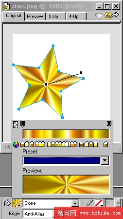 第一個五角星:第一個五角星采用圓錐形(Cone)填色,從屬性欄中的填色面版可以看到使用了多種顏色來體現金屬多種光線的折射效果。因為做的是黃金效果,所以填色采用了黃,桔,棕色為基調。本例的填色依次是: