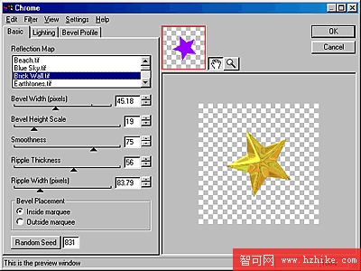 一樣從屬性欄右方添加效果(Effects:+),調用的是鉻合金(Chrome)濾鏡,具體設置見下圖鉻合金濾鏡效果面版。這個五角星就有金屬質感了。
