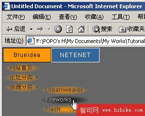 在彈出的對話窗中點Browser按鈕,選擇你剛才FW4中輸出的Html文件,點OK按鈕,剛才做好的彈出菜單就導進來了。如果你的FW4彈出菜單輸出文件沒有在當前的站點中,那麼DW4還會問你是否要將這些文件復制到站點中來,一定要選OK,並且最好單獨為這些文件在站點中建一個文件夾。現在可以按F12預覽一下效果了,是不是不像想象中的那麼cool?彈出菜單好象邊框很粗!因為當前使用的是默認的樣式。沒關系,接下來就來動點小手術!