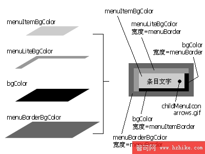 childMenuIcon: 子菜單擴展標記(默認是個小黑箭頭) 彈出菜單的樣式是遵循下圖中的規則的,大家可以細細研究一下,對照起來修改參數。