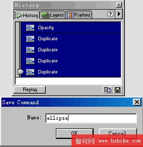 5、打開History(歷史)面板,按住Shift鍵選擇全部記錄。然後按下面板右下角的“磁盤”標記,保存記錄為命令。並在彈出的對話框中為這個命令命名。