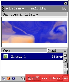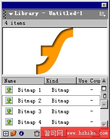 在Flash MX中庫情況,(施加了陰影效果的的矢量標志已經自動轉化為圖片組件。)