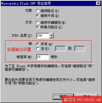 選擇 Micromedia Flash/導出SWF,出現設置面板(下圖)。