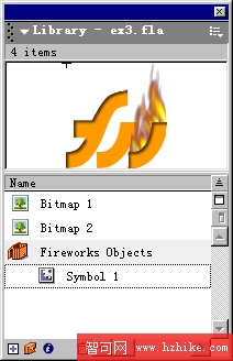 這時打開Flash MX的庫,可以看到Flash MX已經自動建好一個Fireworks MXs Objects的文件夾,剛剛復制過來的物體自動轉化為裡面的一個電影夾(mc)。在這裡Flash MX將施加了效果的圖形轉為像素圖,並且這種像素圖還是透明背景的。