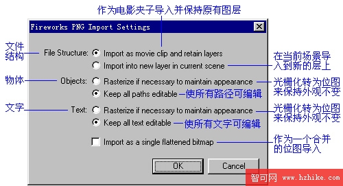 1、導入Fireworks MX的.png源文件 打開Flash MX,在文件菜單中選擇導入,找到你的png源文件,這時會出現導入設置: