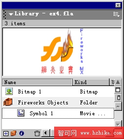 在文件結構中有兩種選擇:一是將png文件作為電影夾導入並保持原有圖層,這樣你可在庫中看到Fireworks MXs Objects,裡面是Flash MX自動為你生成的電影夾,管理和使用都非常方便;二是將.png導入到當前場景新的層上。