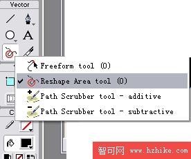 步驟3: 在工具欄上選擇Freeform Tool,按住鼠標將出現一個下拉菜單。選擇Reshape Area Tool,此工具可以通過拖動鼠標直接編輯矢量圖形的輪廓而不需要手工的一個節點一個節點的編輯。