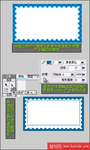 步驟七、再用矩形工具拉出一個矩形,盡量叫矩形占居圖案的靠上位置,下面留出一些空隙,其邊緣筆觸選擇網格線6,透明度100%,從而產生虛線,如矩形有的邊緣沒有顯示虛線,請用“選定工具”點中矩形邊緣的點配合鍵盤微調。
