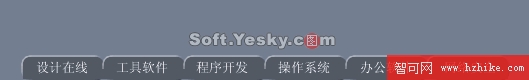 鼠標選取文本工具,在第一個按鈕前定位並輸入“設計在線”四個字,設置字體為仿宋,字體大小為12,字體顏色為白色,如果你覺得色彩不夠鮮艷你可以選擇其它的顏色,或者選中剛才輸入的文本,在屬性窗口中的“效果”列表框中將其銳化。分別對其他按鈕進行如上操作,得到如下視圖: