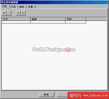 這是一個彈出菜單編輯器,可以對彈出的菜單進行內容、外觀、高級和位置四個選項的設置。