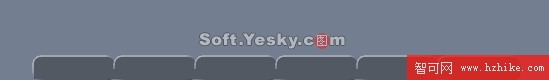 重復地對每一個矩形進行如上操作,設置好後將它們一字排開,間距為1,底線與編輯區底線重合。利用矩形工具再畫一個背景顏色與上面六個矩形背景一樣的矩形,長度與高度分別為485和10,將這個矩形拖到上面六個矩形的前面,底線與編輯區底線重合(這個矩形的作用在於遮擋上面六個矩形之間的間隙,形成一個倒弓狀的按鈕排列陣),效果視圖如下:
