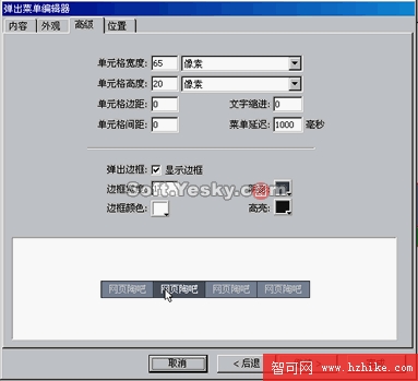 選擇單元格寬度為65像素,高度為20像素,但與各邊框、文字縮進和單元格間距都為0,邊框寬度為1,邊框顏色為白色,陰影和高亮都選擇深色,效果如上圖。接下來要進行位置的設置,單擊位置設置第二個按鈕,將彈出菜單設置在底部,其中有位置的數字定位,在這種情況下X=0,Y=25,讀者可根據按鈕的高度設置Y值,使之達到最佳效果。另外,讀者可以根據自己的愛好設置菜單的外觀,包括菜單上的字體、大小、顏色和對齊方式,也可以設置單元格邊框以及背景的屬性以及鼠標滑過時的字體顏色和單元格背景等屬性。除此之外,讀者還可以嘗試換一種鏈接樣式和菜單樣式進行設計,如果你選則的是圖像樣式的鏈接樣式,你可以根據自己的喜好選擇Fireworks自帶的多種按鈕作為背景,而且你還可以改變菜單樣式為垂直樣式,以達到你的要求。