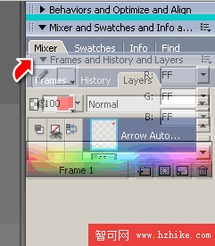 用慣了Fireworks MX,打開Fireworks MX 2004時的第一件事就是重組右側的執行面板。Fireworks MX 2004本身的默認設置(800×600分辨率下),只有Assets,Colors,Frames and History三種面板群組(其他分辨率下右側的面板區域組合會有不同),其余面板仍然藏在Windows彈出菜單下。這樣的設置跟我們以往MX中熟悉的個人自訂的工作界面太不同了,所以開始我們的新工作前要先組織一下已經習慣了的面板,就好像換了個新辦公桌要先做布置,工作起來才得心應手。