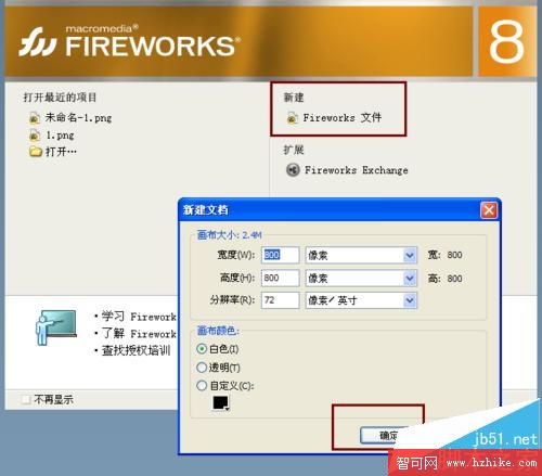 2、新建一個Fireworks的文件,然後我們輸入任意的尺寸,新建一個空白文檔
