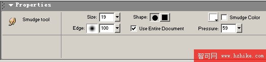 三.全選,同時按下ctrl+shift+alt+z組合鍵,將這組圖形轉化為位圖,選擇菜單Filters-blur-blur more對圖形進行模糊處理,接下來便是讓它“燃燒”起來!使用塗抹工具,對圖形進行加工。這是最關鍵的步驟,點擊塗抹工具後,最下面出現屬性欄(PropertIEs),其中的各個參數值的效果大家必須熟悉。如下圖,其中Size:塗抹范圍大小,Pressure:壓力強度,Edge:尖銳程度(可以理解為羽化范圍),Smudge Color:塗抹的初始“痕跡”顏色,去掉方框內的對號,表示不用初始顏色,在這裡我們將它去掉。