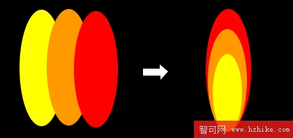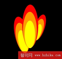 二.在制作燃燒文字之前,我們先練習制作一組火苗,這對理解火焰的走勢有幫助。如下圖,拖畫三個橢圓形,分別填充為黃、橙、紅色,調整大小位置,做下圖的排列,這樣形成焰芯、內焰、外焰的輪廓。