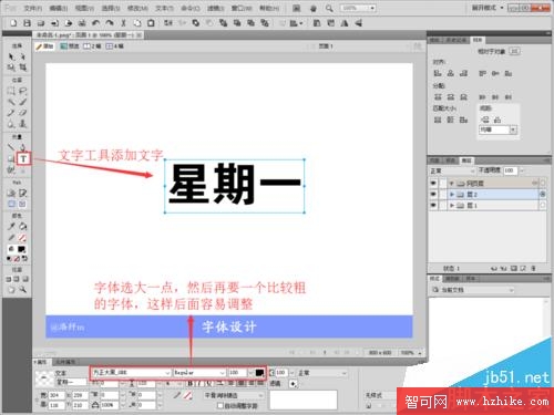 2、使用文字工具添加自己想要設置的文字,然後在屬性欄設置文字的字體,大小,字體要選粗一點的,字體也要大一點的字體,如圖所示(ps:沒有發現屬性欄的同學可以在菜單欄》窗口》屬性,點擊添加設置