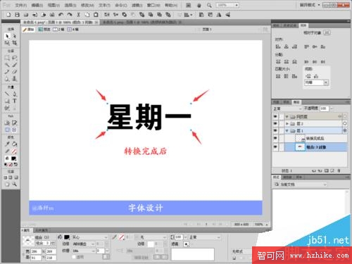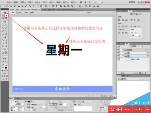 5、轉換完成後使用部分選擇工具操作,點擊文字會出現藍色的點,每個點都可以拖動或者使用鋼筆工具進行形狀變換,我們可以分別為每個文字設置不同的美觀的形狀。出現紅色的點為鼠標經過狀態