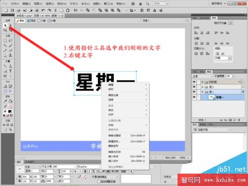 3、點擊指針工具選中我們剛剛的文字(選中會有藍色的線框出現,大家注意),然後右鍵文字出現菜單