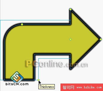 當我們選中該點,會出現背景提示框:Thickness。這樣,我們知道了該調整點的作用是用來調整箭頭的厚度或者說是寬度了。下圖調整的前提是已經將箭頭變成了彎角箭頭,大家可以在沒有變成彎角箭頭的前提下拖動該點,看看效果如何。