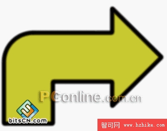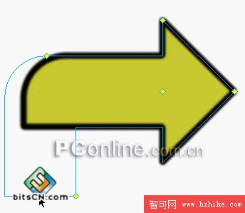 當我們選中該點進行調整的時候,不會出現相應的背景提示框。但是奇妙的事情是我們可以向下、向左右方向進行拖拽了(不能向上,也就是說,不能比箭頭的現有水平高度還小),形成了彎角箭頭,如下圖所示: