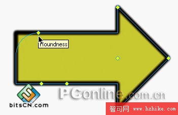 當我們選中該調整點的時候,就出現一個黃色背景的提示框:Roundness。圓角數值調整。向箭頭的方向拖動鼠標,會發現原來的默認直角會變成圓弧的樣式。
