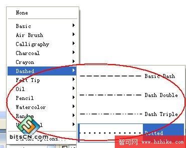 然後彈出筆刷設定對話框,選擇筆刷的樣式為虛線,再設定虛線筆刷的樣式,如圖7-3