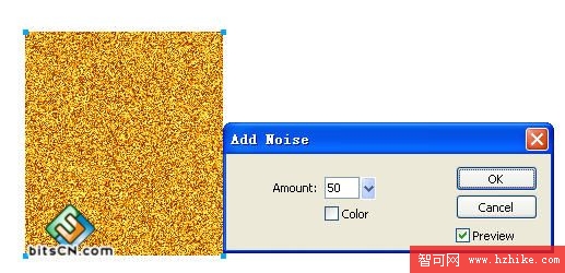 除了模糊效果,2004 版本還增加了添加雜色(Add Noise)的濾鏡特效, 有了這個功能我們可以在Fireworks中設計自己的材質了。先畫一個矩形,然後添加雜色,數值設定為50。如圖8-1。