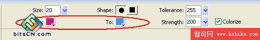 我們將這紫紅色鮮花,部分花瓣的顏色替換成其他的色彩。使用替換色彩工具,然後在屬性面板中設定工具的形狀為圓形,大小為20,容差為255,壓力為200。特別注意的是我們要設定將圖片中的哪種顏色,替換成哪種顏色,這裡將Change中准備替換的顏色設定為紫紅色(用墨水筆在圖片的花瓣上取色),在To替換後的顏色設定為淺藍色。如圖9-3。