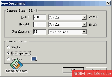 打開FW4,選擇File菜單下的New,或者按Ctrl+N快捷鍵,如圖一新建一個文件,尺寸200X30像素,精度72像素/英寸,背景透明。
