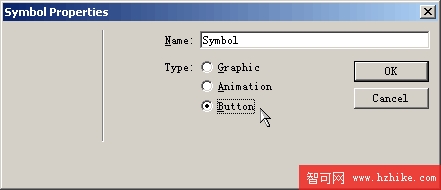 同時選中對齊後的文字和矩形,選擇Insert菜單下的Convert to Symbol,或在矩形上點鼠標右鍵,在右鍵菜單裡選Convert to Symbol,或者按F8快捷鍵,在彈出對話框裡的Type中選Button(按鈕),將這個矩形轉換成一個按鈕對象,