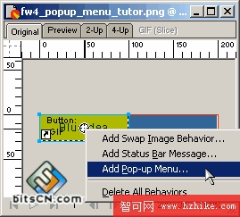 這時,將鼠標移到按鈕對象中間的圓形標志上鼠標會變成手形,單擊圓形標志,在彈出菜單中選擇Add Pop_up Menu…,