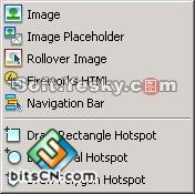 首先需要將Fireworks HTML文件導出到已定義的Dreamweaver站點中,將光標放在文檔中要插入的位置。選擇“Insert” -> “Image Objects”->“Fireworks Html”或者在插入面板的“Common”類別中單擊插入圖像按鈕旁邊的倒三角形,這時會彈出圖8所示的下拉菜單。